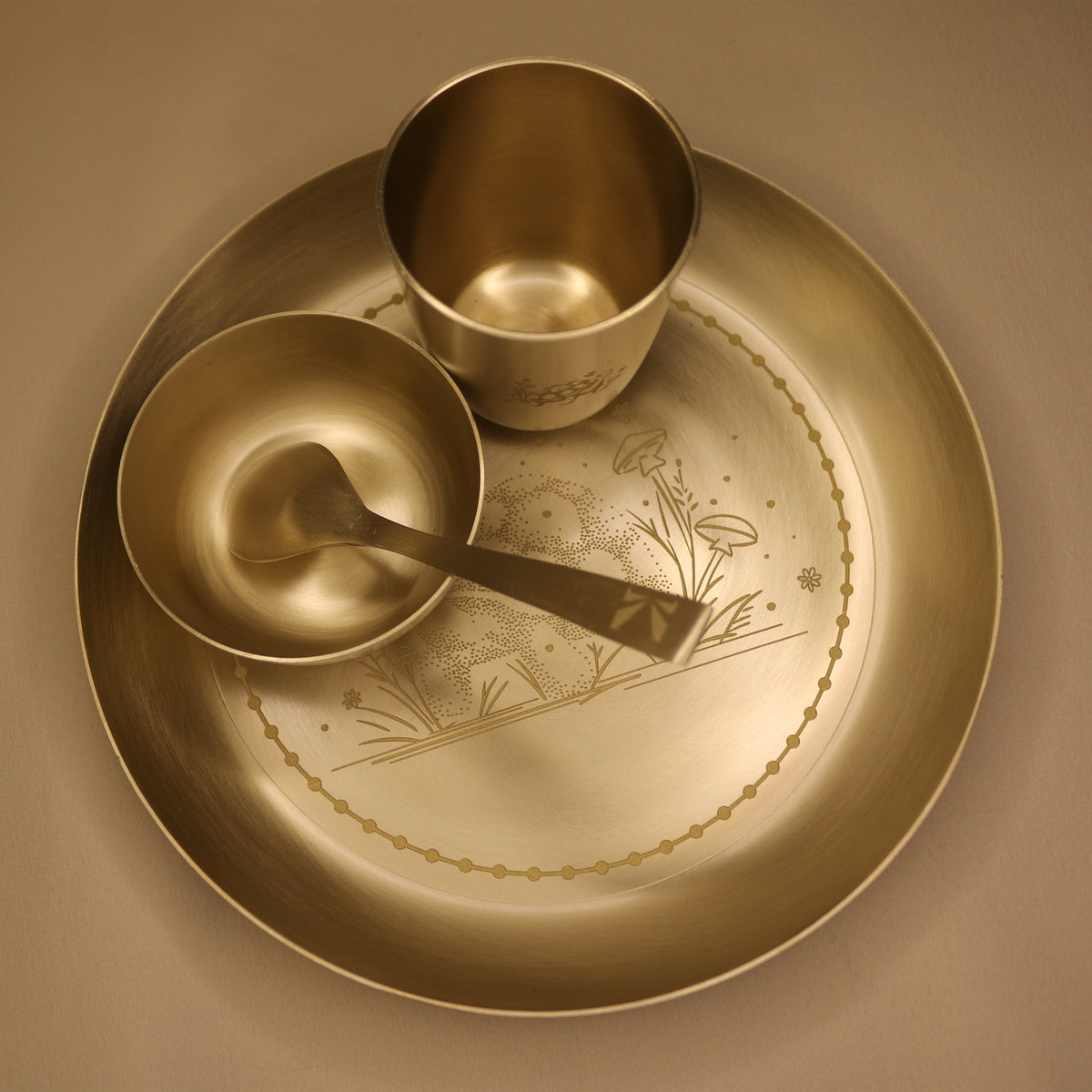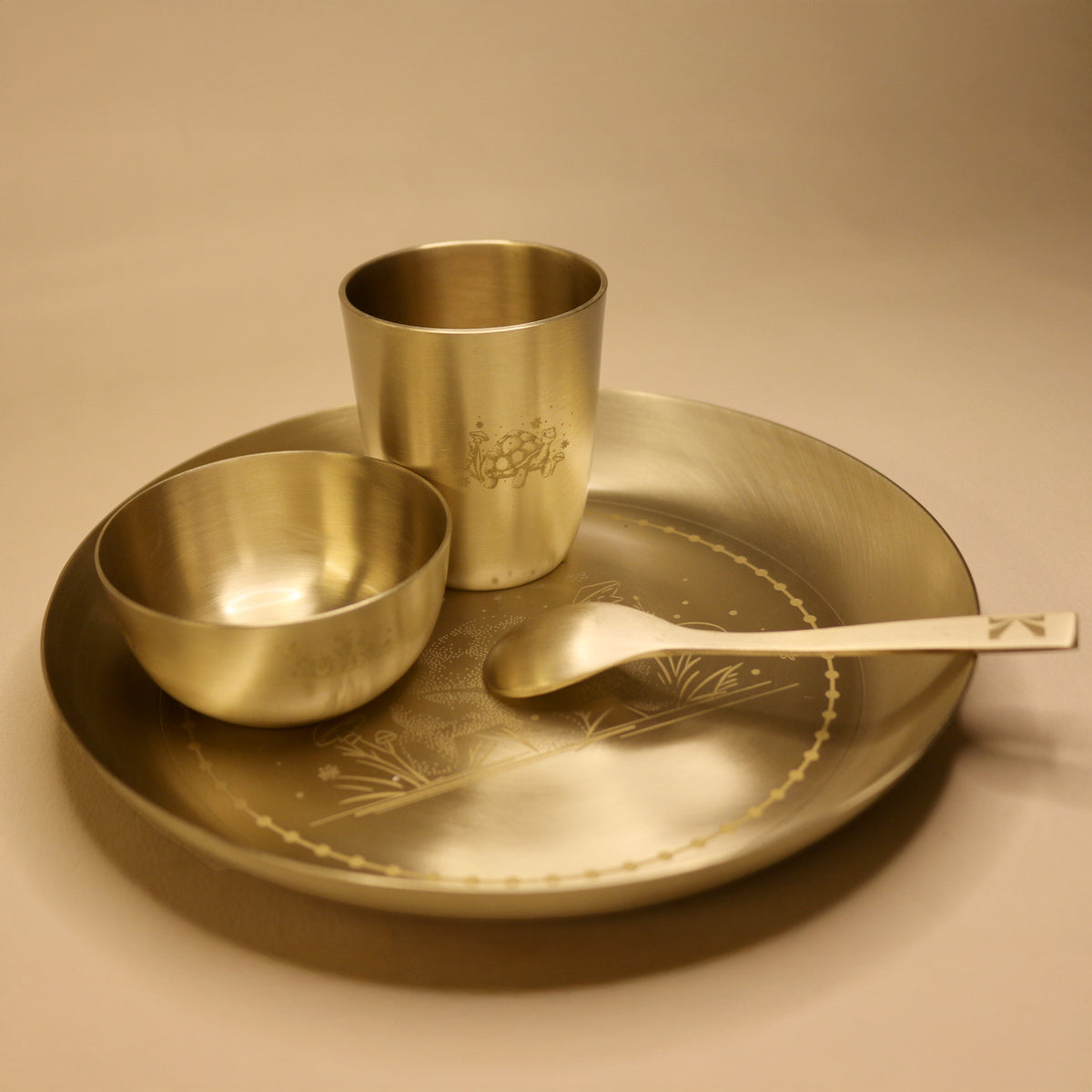 Each thali, katori, glass, and spoon in this set is handcrafted and softly polished, carrying with it a gentle glow. Over time, a natural patina may appear - this is not a flaw, but a quiet reminder that this collection is designed to feel lived-in, loved, and lasting.